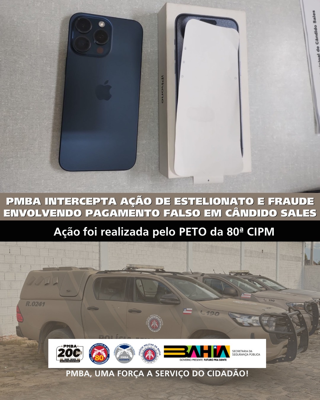 A tarde desta segunda-feira (09) não terminou bem para quem tentou levar vantagem em cima do trabalho alheio em Cândido Sales. Uma ação rápida da 80ª Companhia Independente de Polícia Militar (CIPM) frustrou uma tentativa de estelionato que envolvia um item de alto luxo: um iPhone 15 Pro Max.