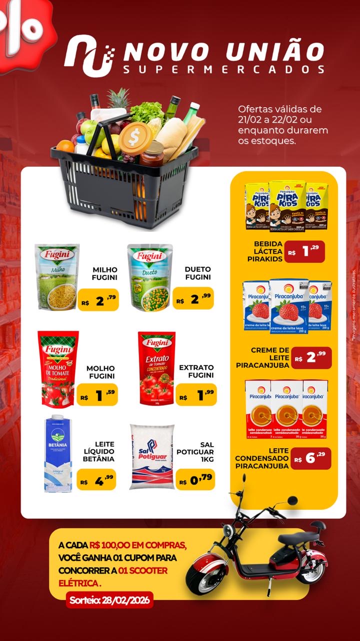 O Novo União Supermercados preparou uma seleção de ofertas imbatíveis para este sábado (21/02) e domingo (22/02), ou enquanto durarem os estoques. Além de garantir o menor preço para o seu final de semana, você ainda pode sair de scooter elétrica nova!