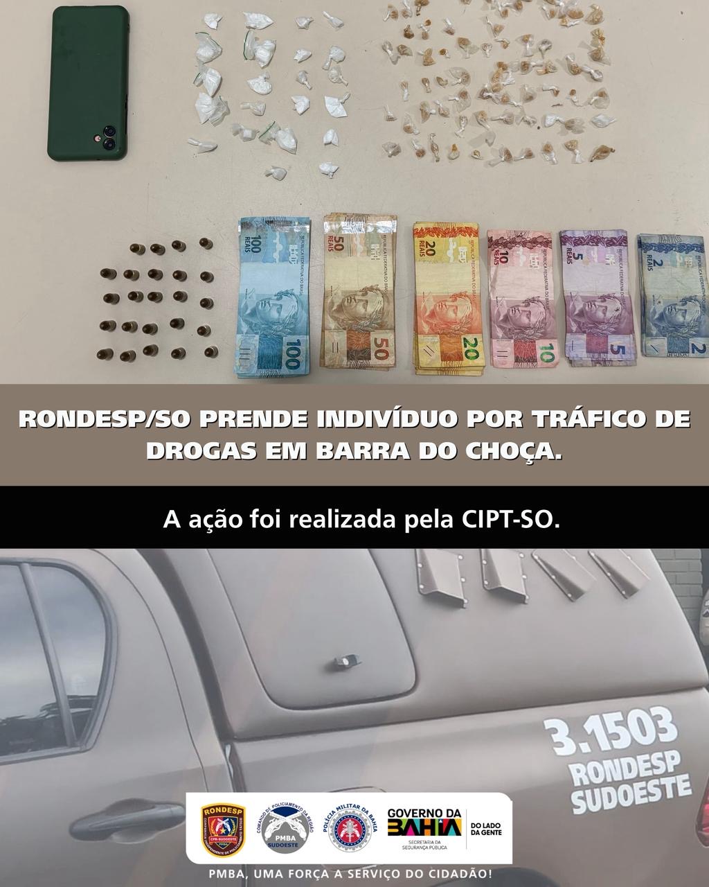 Uma operação da CIPT-SO (RONDESP) resultou na desarticulação de um ponto de venda de drogas no município de Barra do Choça. A ação foi fruto de um trabalho prévio de inteligência, com monitoramentos e denúncias que apontavam uma movimentação suspeita, típica do tráfico de entorpecentes, em um imóvel da cidade.