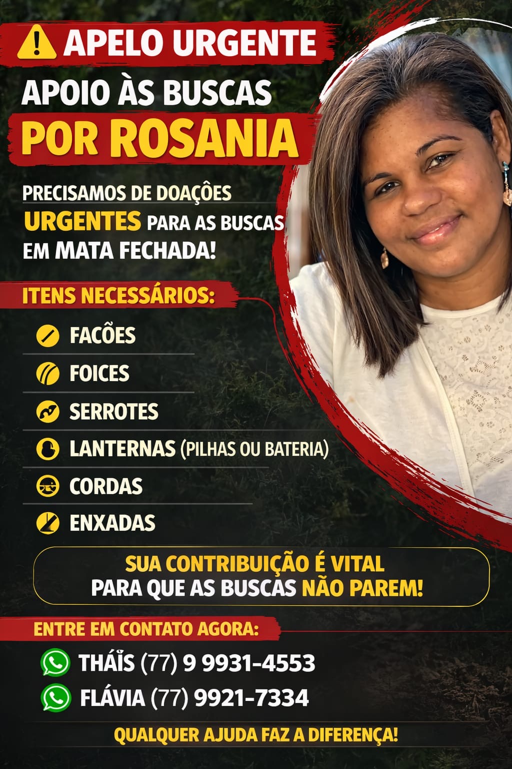 A força-tarefa para localizar Rosânia segue em andamento, mas os voluntários que estão atuando na linha de frente precisam urgentemente do apoio da população. Uma campanha de arrecadação foi lançada para garantir que as operações de busca na mata fechada não sejam paralisadas por falta de suprimentos.