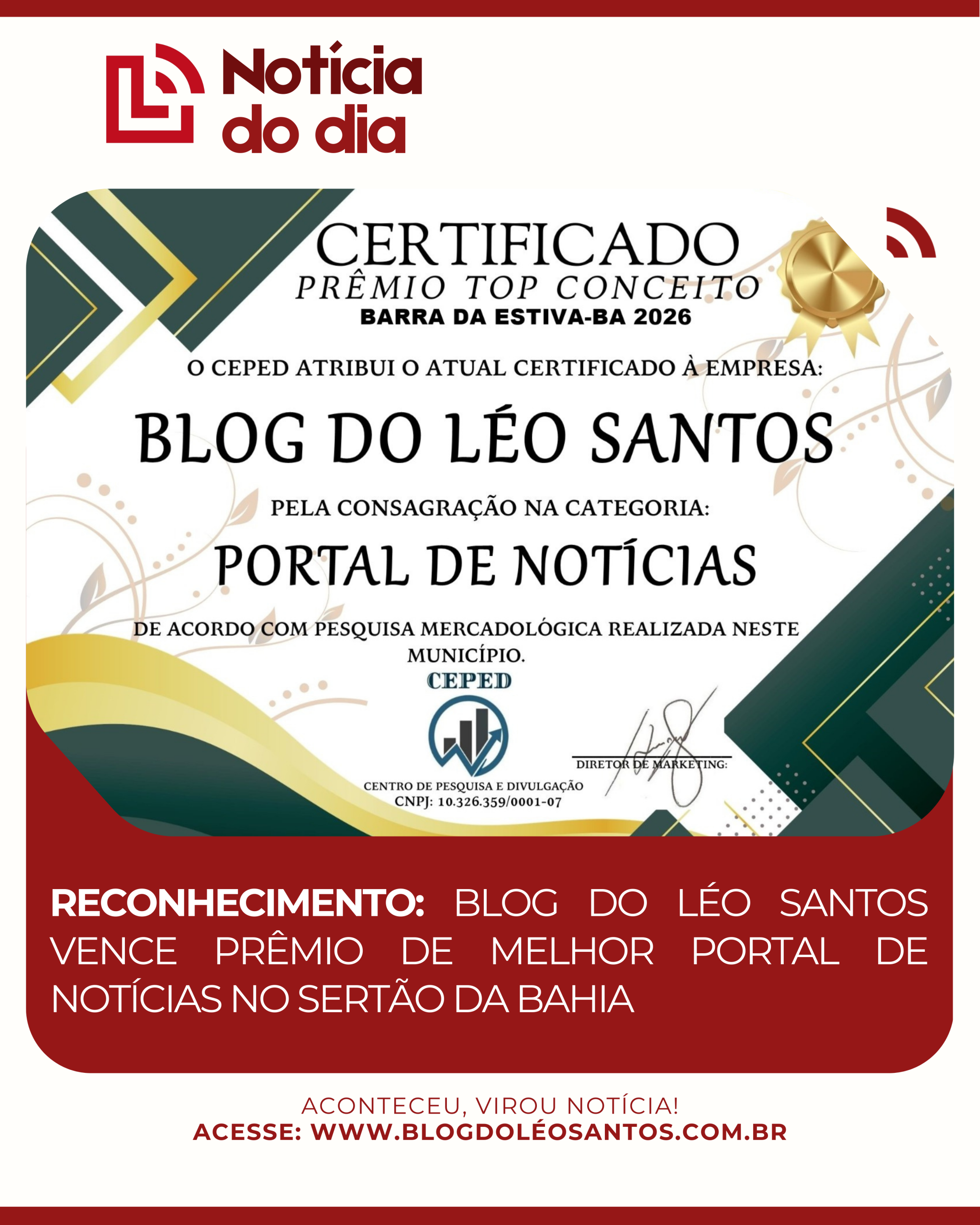 É com muita alegria que compartilhamos essa vitória com vocês! O Blog do Léo Santos conquistou o Prêmio Top Conceito 2026 na categoria Portal de Notícias, na cidade de Barra da Estiva, localizada no Sertão da Bahia.