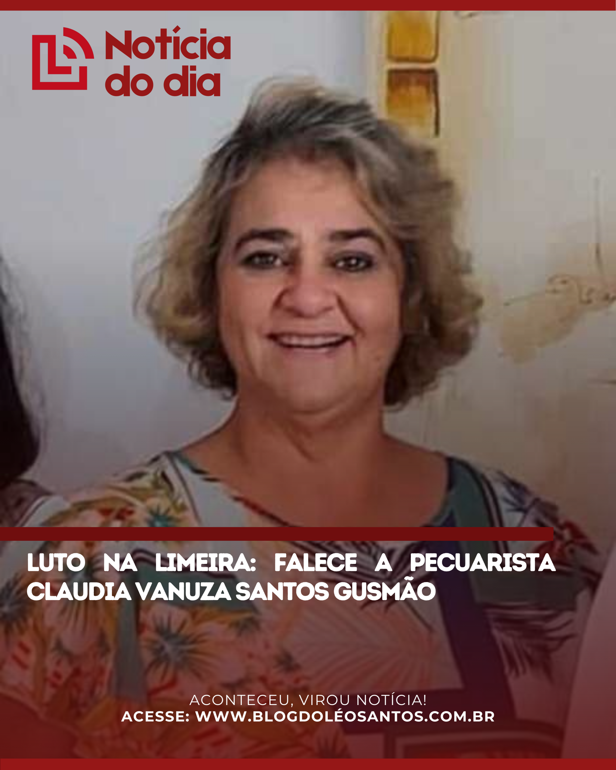 É com profundo pesar que informamos o falecimento de Claudia Vanuza Santos Gusmão, pecuarista muito conhecida e querida na região da Limeira, zona rural de Vitória da Conquista. Claudia faleceu após enfrentar complicações de saúde. Ela chegou a receber atendimento médico no Hospital São Vicente, mas infelizmente não resistiu.