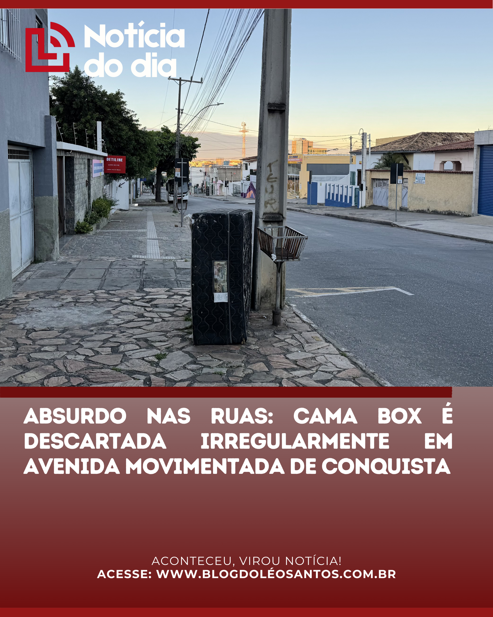 Uma cena de puro descaso chamou a atenção e gerou revolta em Vitória da Conquista nesta quarta-feira (18). O repórter Mateus Araújo flagrou uma situação completamente absurda: uma cama box inteira abandonada em plena calçada de uma das avenidas mais movimentadas da cidade.