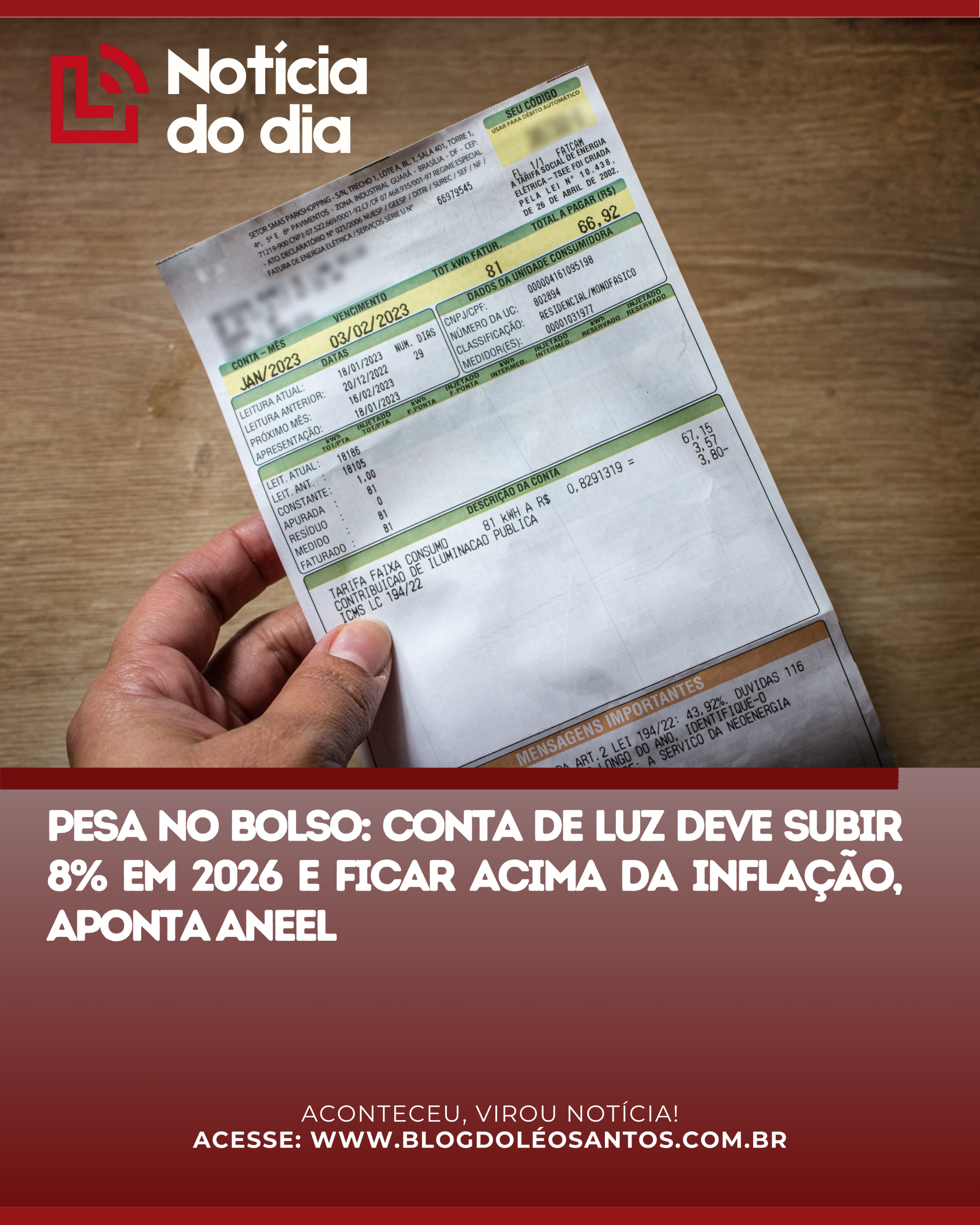 O consumidor brasileiro precisa preparar o bolso para mais um impacto no orçamento neste ano. Segundo as projeções do InforTarifa, da Agência Nacional de Energia Elétrica (Aneel), a conta de luz dos brasileiros deve sofrer um aumento médio de 8% em 2026. Esse reajuste esperado fica bem acima da inflação projetada para o período, que é de 3,9% pelo IPCA e 3,1% pelo IGP-M.