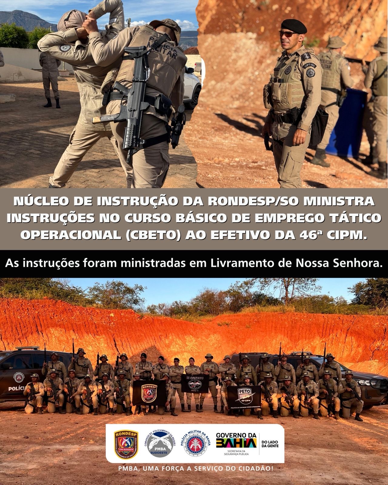 Entre os dias 16 e 19 de março de 2026, a Polícia Militar da Bahia (PMBA) promoveu o Curso Básico de Emprego Tático Operacional (CBETO 2026.5). A capacitação foi conduzida pela RONDESP Sudoeste no município de Livramento de Nossa Senhora, tendo como público-alvo o efetivo da 46ª Companhia Independente de Polícia Militar (CIPM).