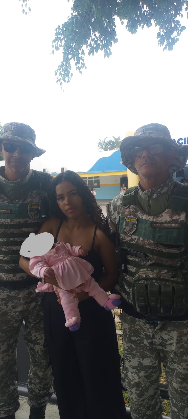 Os agentes Paulo Torres e Amaral, integrantes do Grupamento de Apoio ao Meio Ambiente (GAMA), foram acionados pela senhora Mariana Santos, que relatou que sua filha, a pequena Aila Santos, estava engasgada.