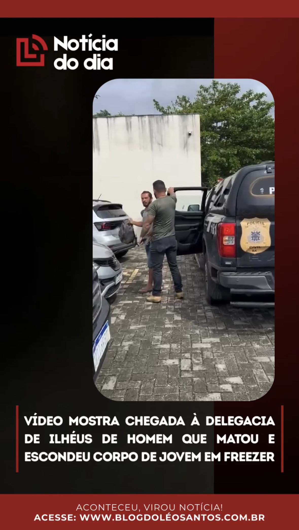 Um vídeo registrado na tarde desta segunda-feira (30) mostra o momento exato em que o principal suspeito do assassinato de Manuela Matos, de 23 anos, chega à delegacia da cidade de Ilhéus, no sul da Bahia. Nas imagens, o homem, identificado como Lucas Santos, de 29 anos, aparece de bermuda e camiseta, sendo escoltado por um agente da Polícia Civil ao desembarcar da viatura, logo após a sua prisão.