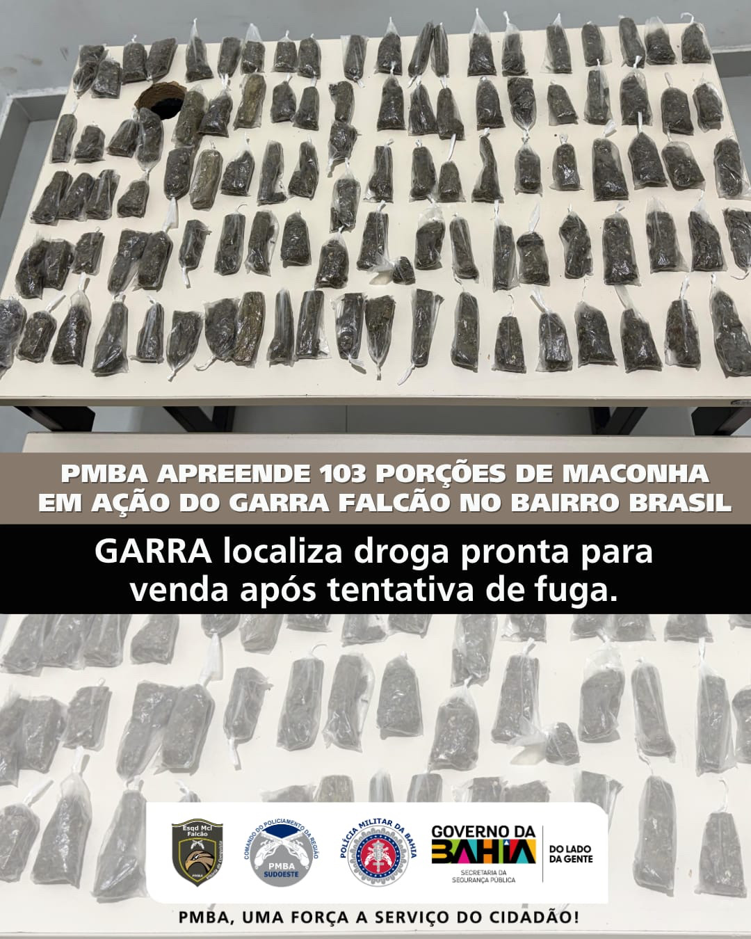 Durante a verificação do que havia sido dispensado na via, os policiais encontraram no interior da sacola 103 porções de substância análoga à maconha, todas já embaladas e prontas para a comercialização. A corporação destacou ainda que o jovem preso já é um velho conhecido das autoridades, acumulando outras três passagens anteriores pelo mesmo crime de tráfico de drogas.