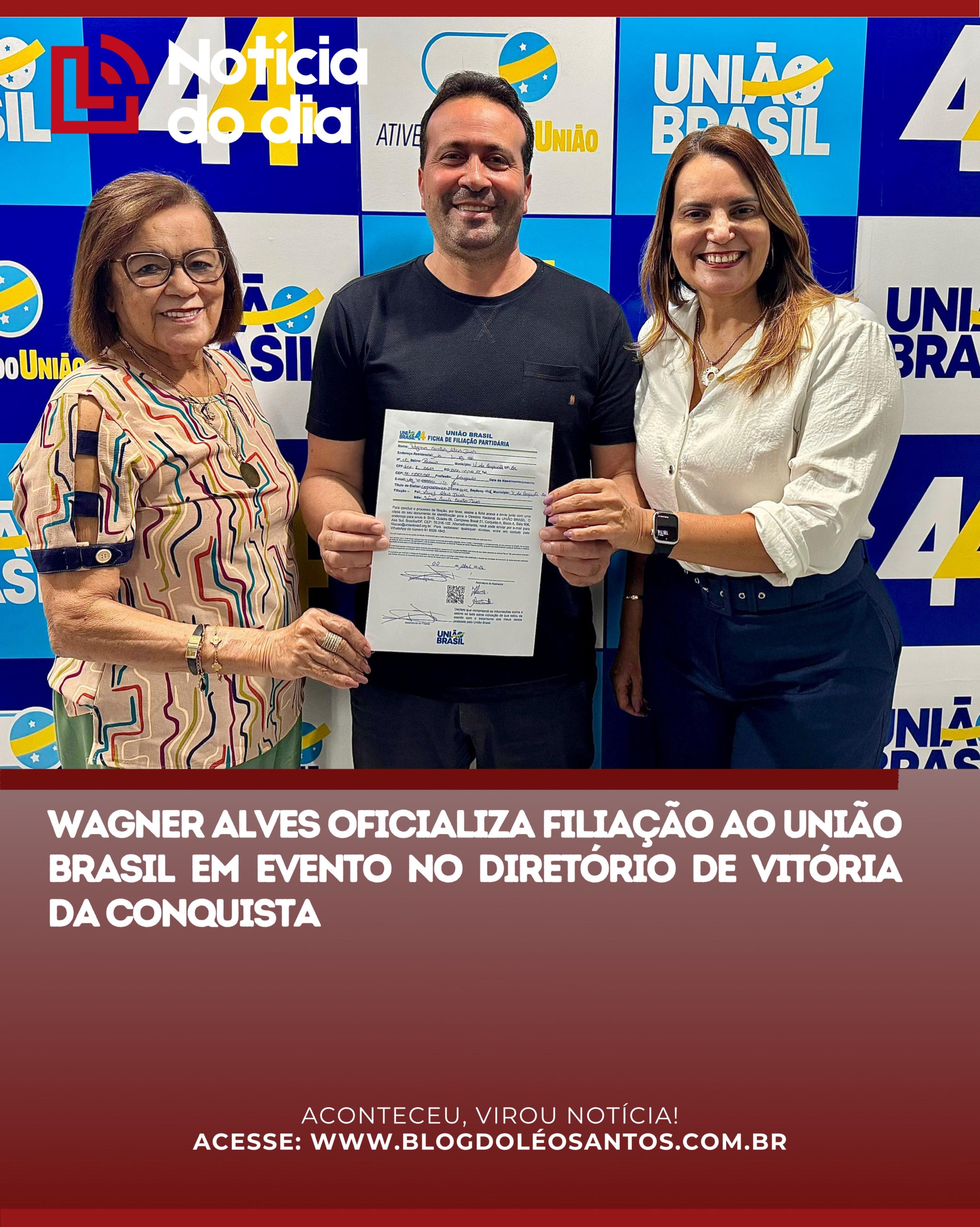 O pré-candidato a deputado estadual, Wagner Alves, oficializou a sua filiação ao partido União Brasil na manhã desta quinta-feira (02). O ato político aconteceu no Diretório Regional da sigla, localizado em Vitória da Conquista. A ficha de filiação do novo membro foi abonada, à distância, pelo vice-presidente nacional do partido e pré-candidato ao Governo da Bahia, ACM Neto, e referendada localmente pela presidente do União Brasil no município, Irma Lemos.