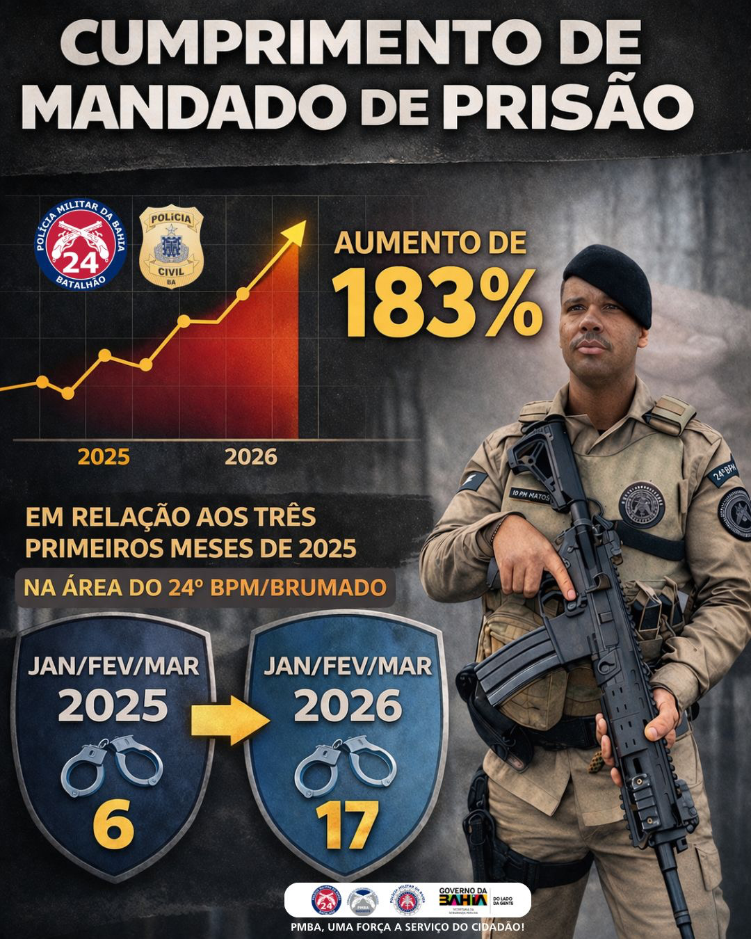 O 24º Batalhão de Polícia Militar (BPM), sediado em Brumado, apresentou um balanço altamente positivo de suas ações operacionais neste início de ano. O grande destaque do período é o aumento expressivo de 183% no número de capturas de indivíduos que possuíam mandados de prisão em aberto expedidos pela Justiça.