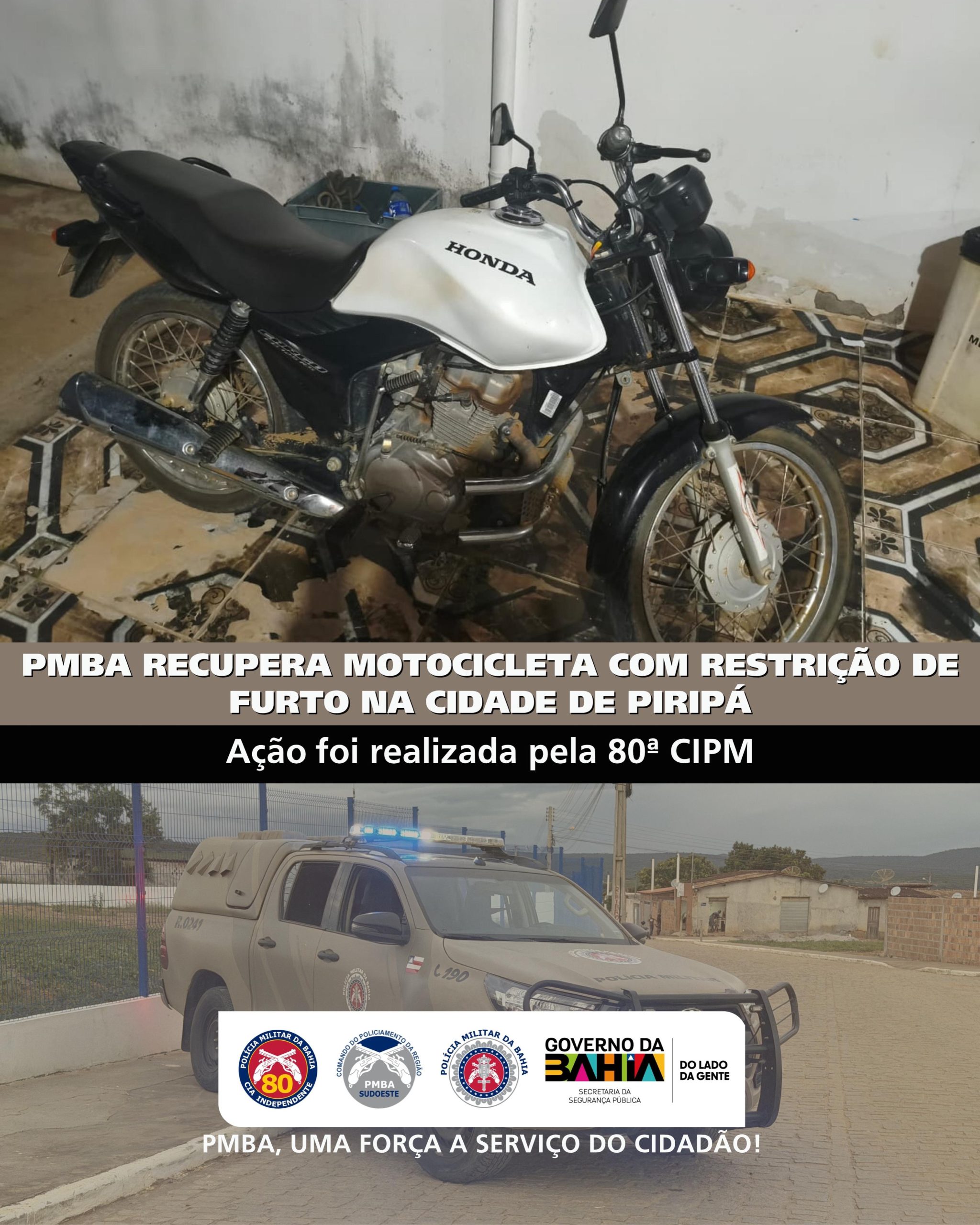 Na noite desta quarta-feira (08), por volta das 18h58, policiais da 80ª Companhia Independente de Polícia Militar (CIPM) recuperaram uma motocicleta furtada durante uma ação no centro do município de Piripá. A recuperação ocorreu no âmbito da Operação Scutum Viarum, momento em que a guarnição visualizou o veículo trafegando pela rodovia BA-263, já no perímetro urbano da cidade, e decidiu realizar a abordagem.