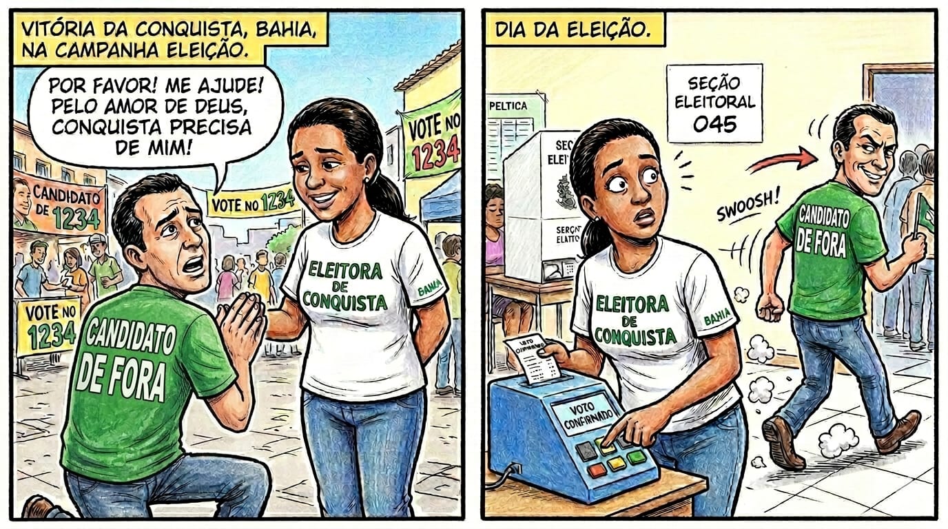 Enquanto os votos são pulverizados, candidatos de outras regiões utilizam Conquista como base complementar para alcançar o quociente eleitoral necessário e garantir vaga na Assembleia Legislativa ou na Câmara Federal. Após eleitos, porém, a presença deixa de existir e os investimentos destinados ao município nunca acompanham a confiança expressiva que os eleitores depositaram nas urnas.