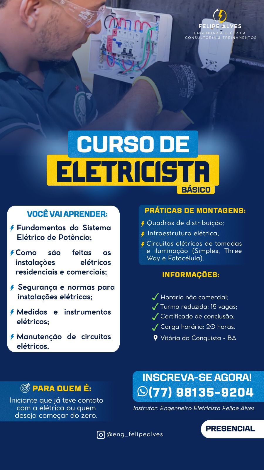 Uma excelente oportunidade para quem busca ingressar no mercado de trabalho, ou se qualificar profissionalmente, está sendo oferecida em Vitória da Conquista. Trata-se de um curso de Instalações Elétricas, voltado à formação técnica e prática de novos profissionais na área.