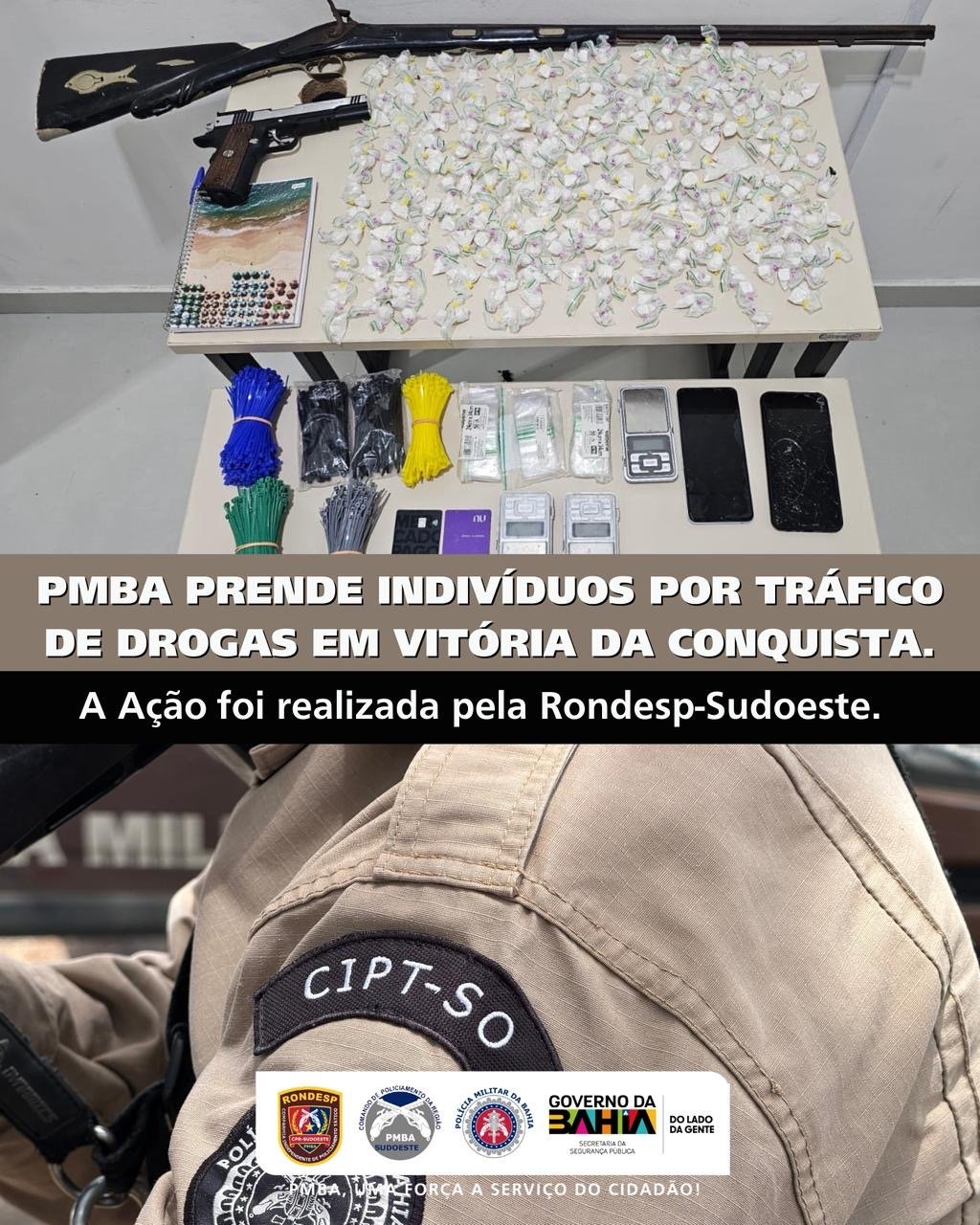 Na tarde deste domingo (19), guarnições da Rondesp Sudoeste realizaram a apreensão de drogas e a condução de suspeitos envolvidos com o tráfico em Vitória da Conquista. A ocorrência teve início durante um patrulhamento tático realizado pelas equipes no bairro Urbis V, especificamente nas imediações da Praça do Angel.