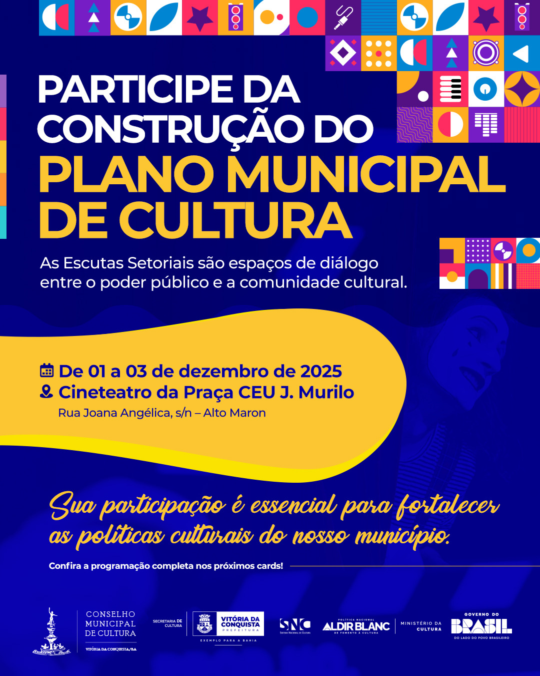 Atenção, artistas, produtores e fazedores de cultura de Vitória da Conquista! A partir da próxima segunda-feira, 1º de dezembro, a Prefeitura dará início às escutas presenciais para a elaboração do Plano Municipal de Cultura (PMC).