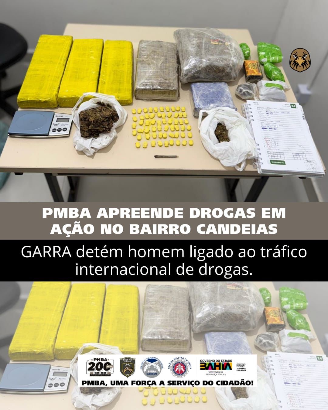 O Esquadrão de Motociclistas Falcão deu mais uma pancada no tráfico de drogas em Vitória da Conquista na tarde desta segunda-feira (08). Uma ação rápida da equipe do GARRA (Grupo de Ações Rápidas Repressivas Avançadas) resultou na prisão de um homem de 38 anos e na apreensão de uma grande variedade de entorpecentes no bairro Candeias.