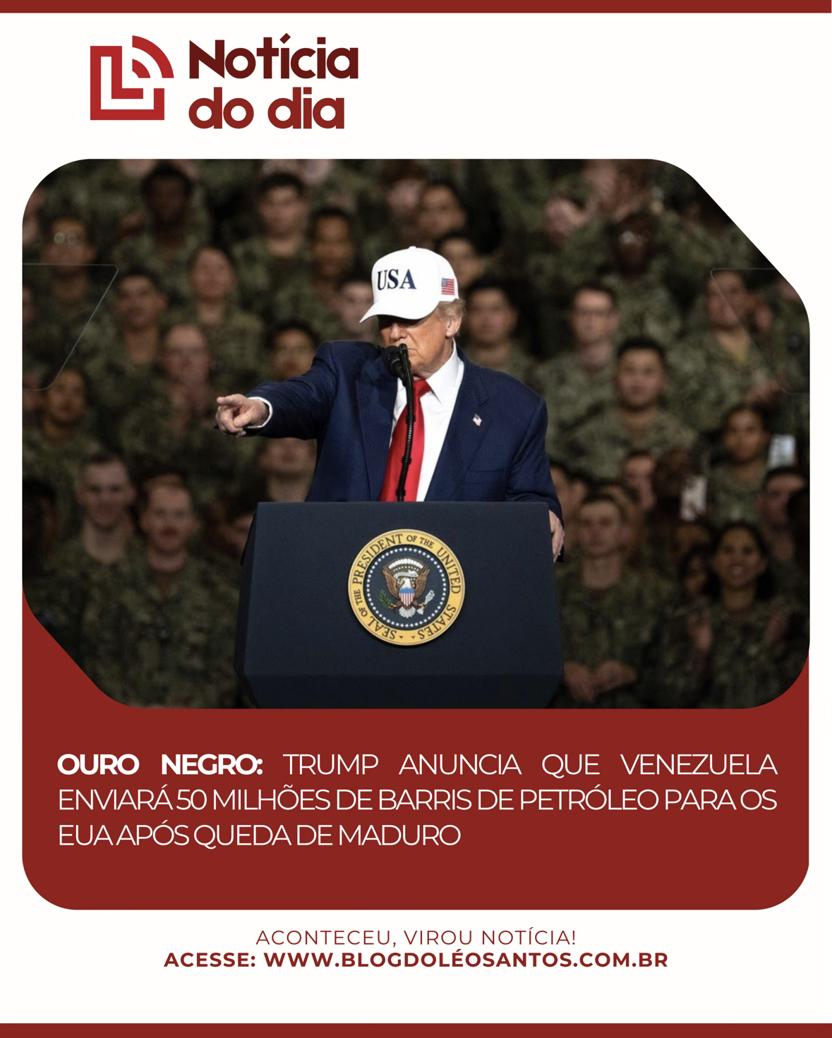 O presidente dos Estados Unidos, Donald Trump, fez um anúncio de impacto nesta terça-feira (06). Segundo o republicano, os EUA receberão um carregamento de até 50 milhões de barris de petróleo vindos da Venezuela.