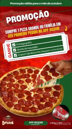A Pizza Drone, uma das pizzarias delivery mais queridas de Vitória da Conquista, lançou uma promoção especial para conquistar novos clientes durante todo o mês de outubro.