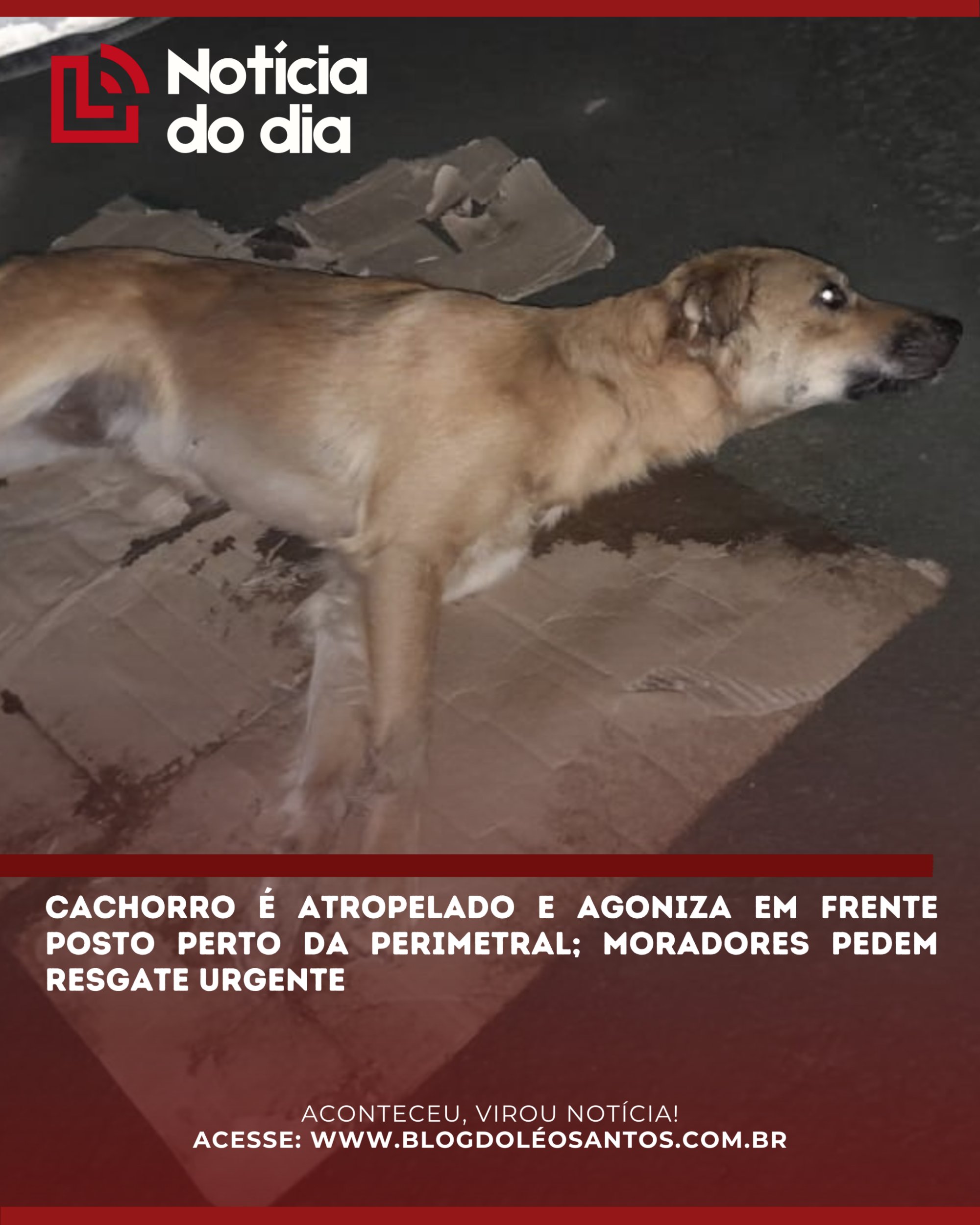 Cachorro é atropelado e agoniza em frente posto perto da Perimetral; moradores pedem resgate urgente