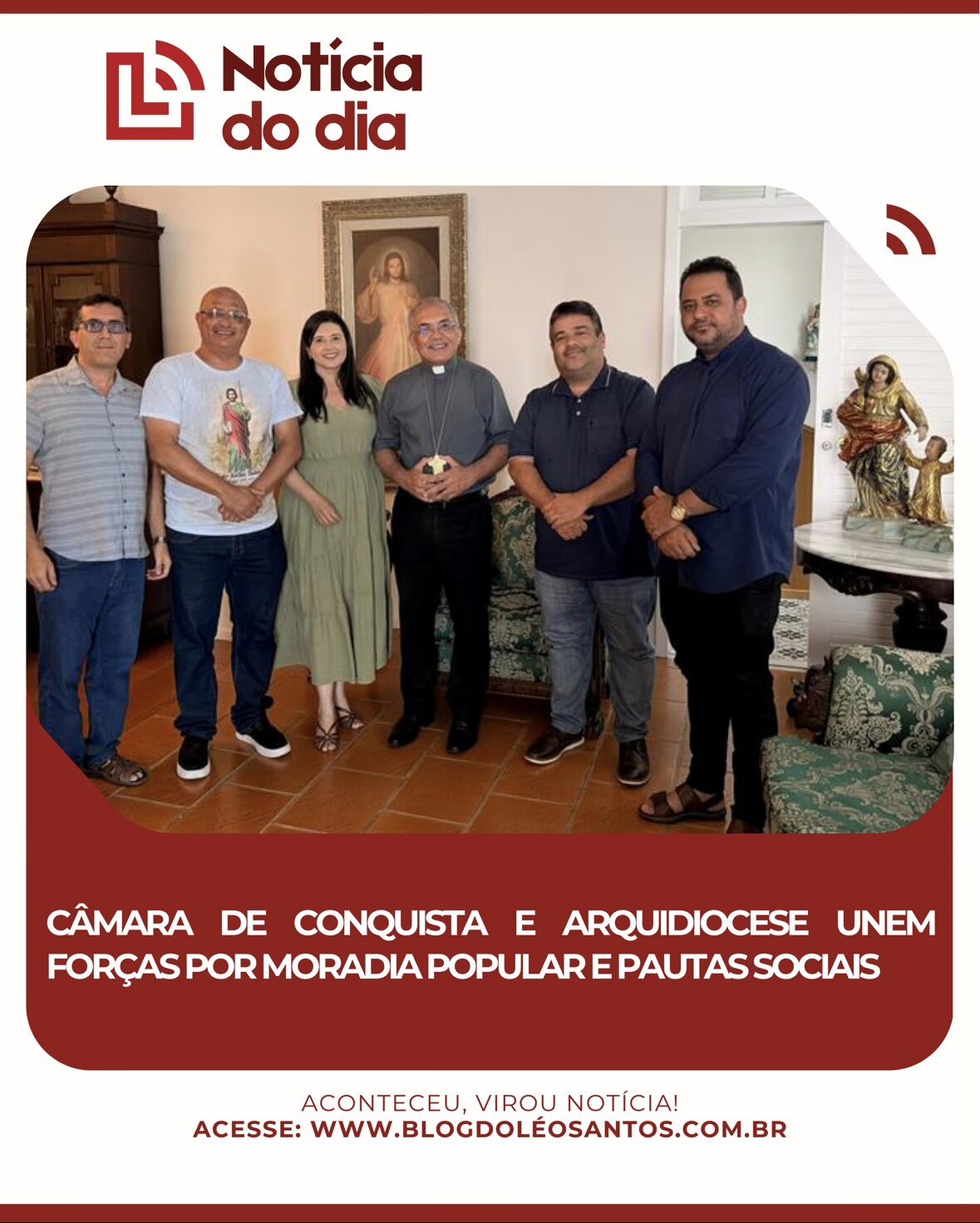 O fortalecimento das políticas públicas de habitação e a integração entre o Poder Legislativo e as pautas sociais da Igreja Católica foram os temas centrais de uma importante visita institucional realizada neste sábado em Vitória da Conquista. O presidente da Câmara Municipal, Ivan Cordeiro, acompanhado pelos vereadores Cris Rocha e Luis Carlos Dudé, foi recebido pelo Arcebispo Metropolitano Dom Vítor Aguinaldo de Menezes para discutir ações conjuntas em benefício da comunidade. Durante o encontro, os parlamentares destacaram que o tema da Campanha da Fraternidade (CF) 2026 já encontra eco em medidas concretas aprovadas pelo Legislativo conquistense, como a indicação unânime para que a Prefeitura utilize R$ 30 milhões de recursos do Finisa exclusivamente para a construção de unidades habitacionais voltadas à população de baixa renda.