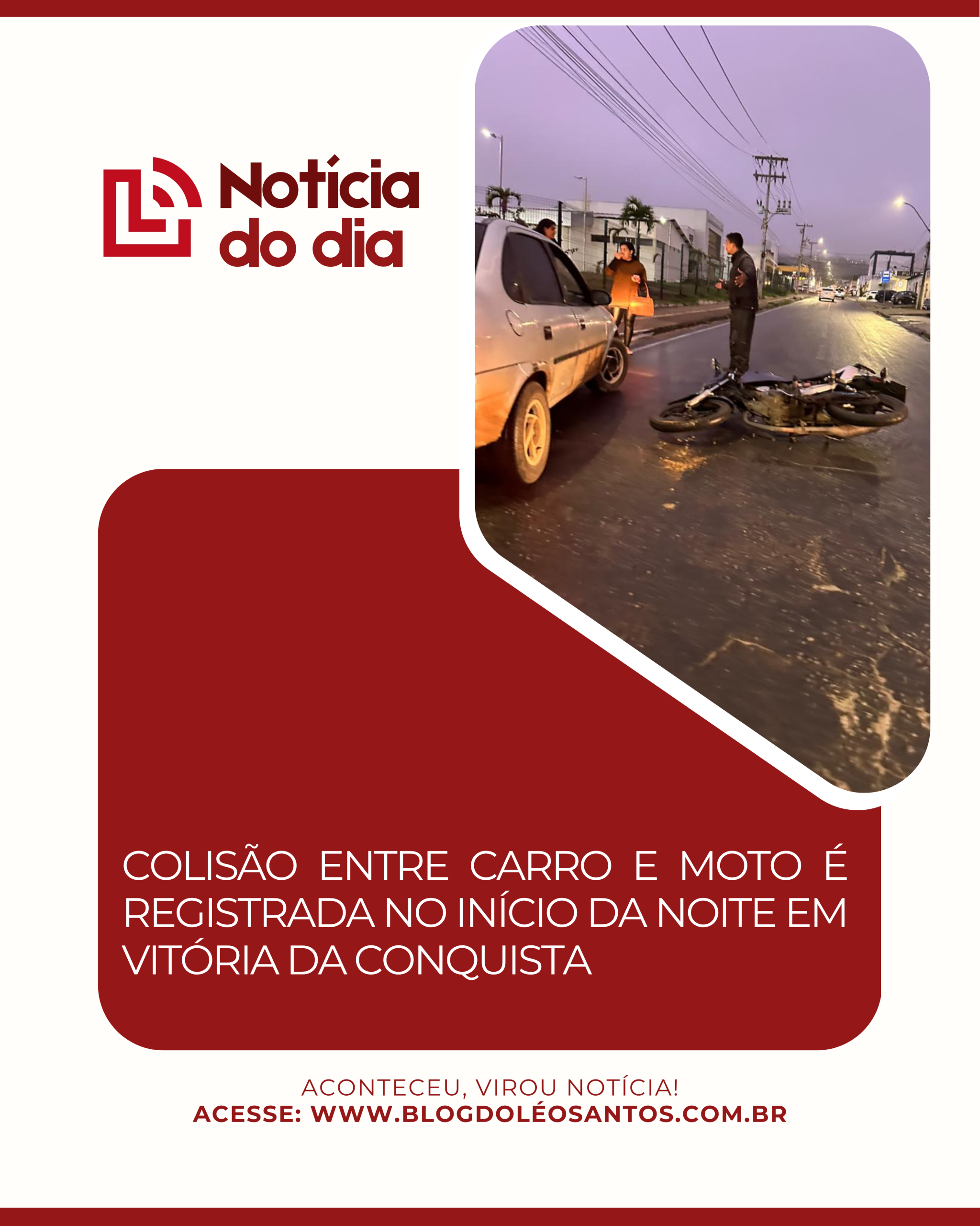 Um acidente envolvendo um carro e uma motocicleta foi registrado por volta das 18:00h desta segunda-feira (10), em Vitória da Conquista.