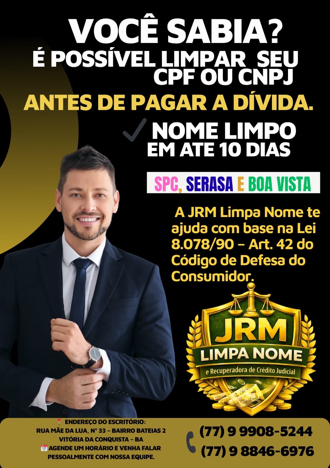 Você sabia que é possível regularizar a sua situação nos órgãos de proteção ao crédito antes mesmo de quitar a dívida total? Essa é a proposta da JRM Limpa Nome, que traz para Vitória da Conquista um serviço especializado para quem precisa recuperar a tranquilidade financeira de forma rápida.